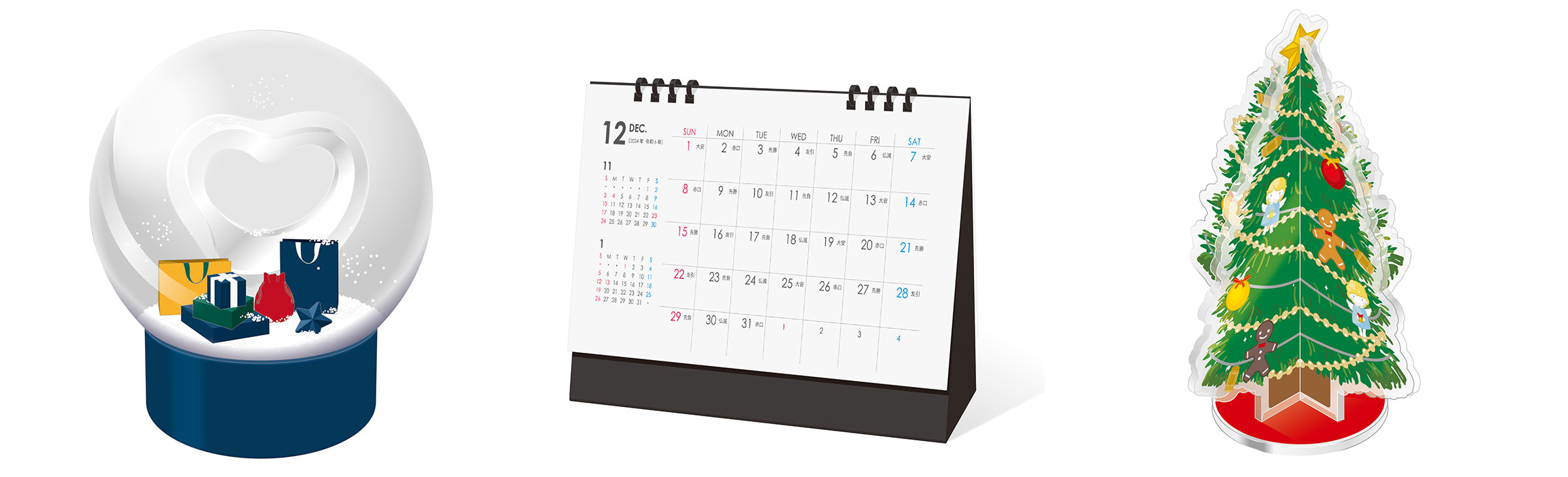オリジナリティのあるスノードームやアクリル製のクリスマスツリーなど、季節感のある商材だけでなく、 カレンダー、お年賀タオルといった年末年始のご挨拶品もご提案させていただきます。