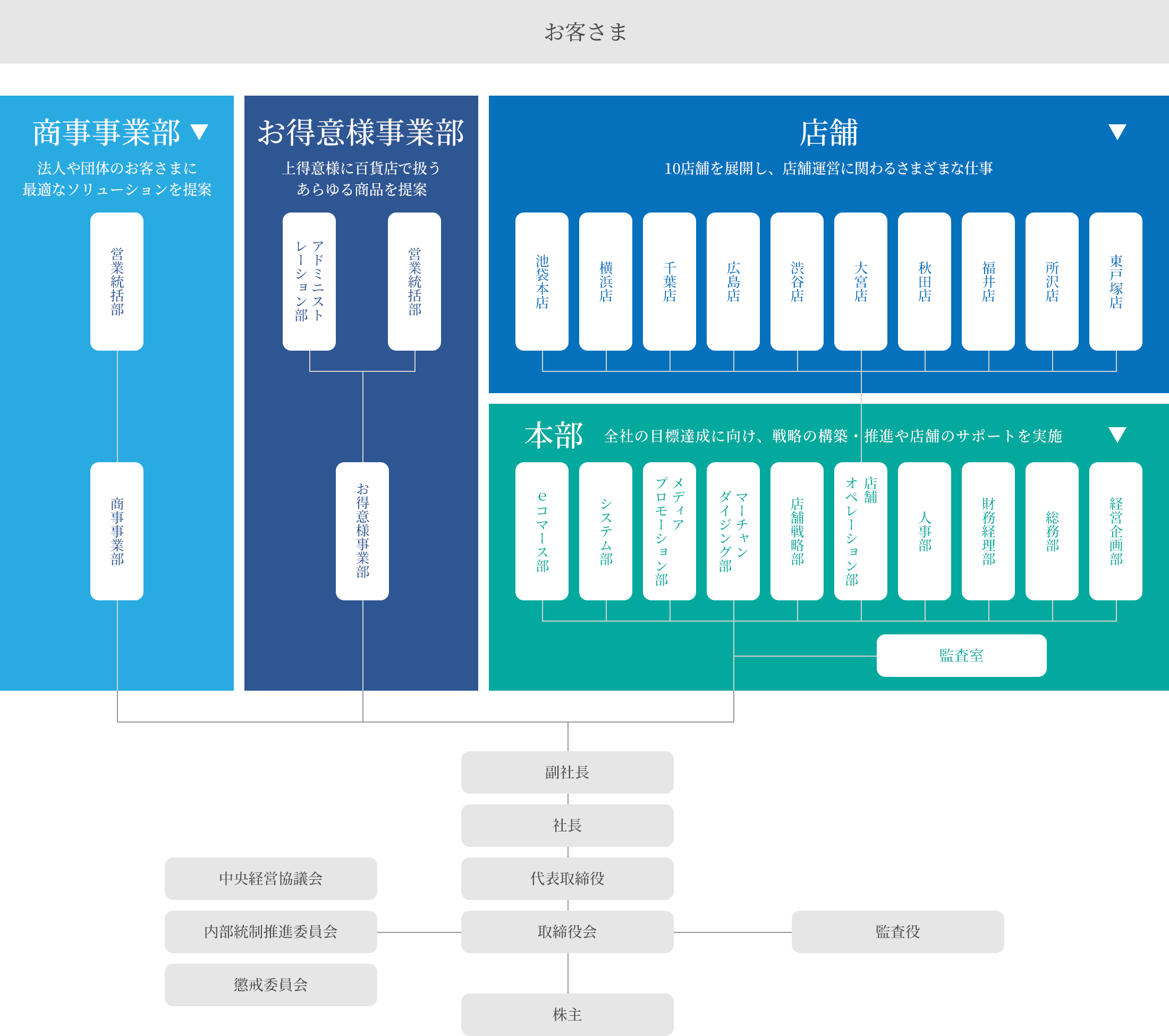 「百貨店」の仕事と聞くと、接客・販売をまず初めに思い浮かべる方も多いと思います。しかし、総合職の社員のうち、売場での接客・販売をメインの業務としている「販売スタッフ」は約4%しかいません。多くは、上得意のお客さまを対象としたお得意様セールス、法人・団体向けのBtoBビジネスを行う商事セールス、マーチャンダイザー、販売促進、マネジメント、経営企画・人事・総務・会計・商品管理といった管理系の業務などを担当しています。