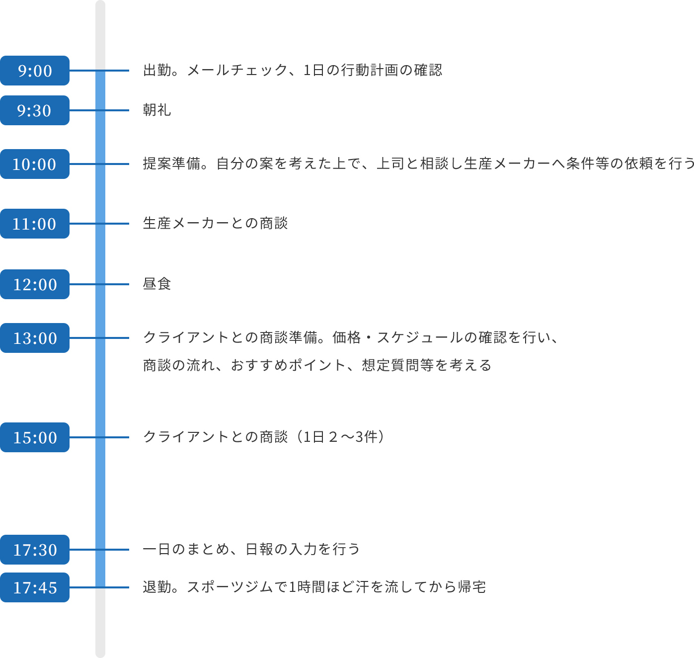 Point商事事業部に異動して半年経ったころ、初めて新人セールスのOJTを任されました。自分自身もまだ仕事を覚えている最中だったため最初は戸惑いましたが、学んだことを自分の中にインプットするだけでなく、OJTを通じてアウトプットすることで知識も定着し、同時に先輩としての自覚も芽生えました。良いプレッシャーを感じながら営業としても成長でき、今の基盤を形成できた時期だったと思います。