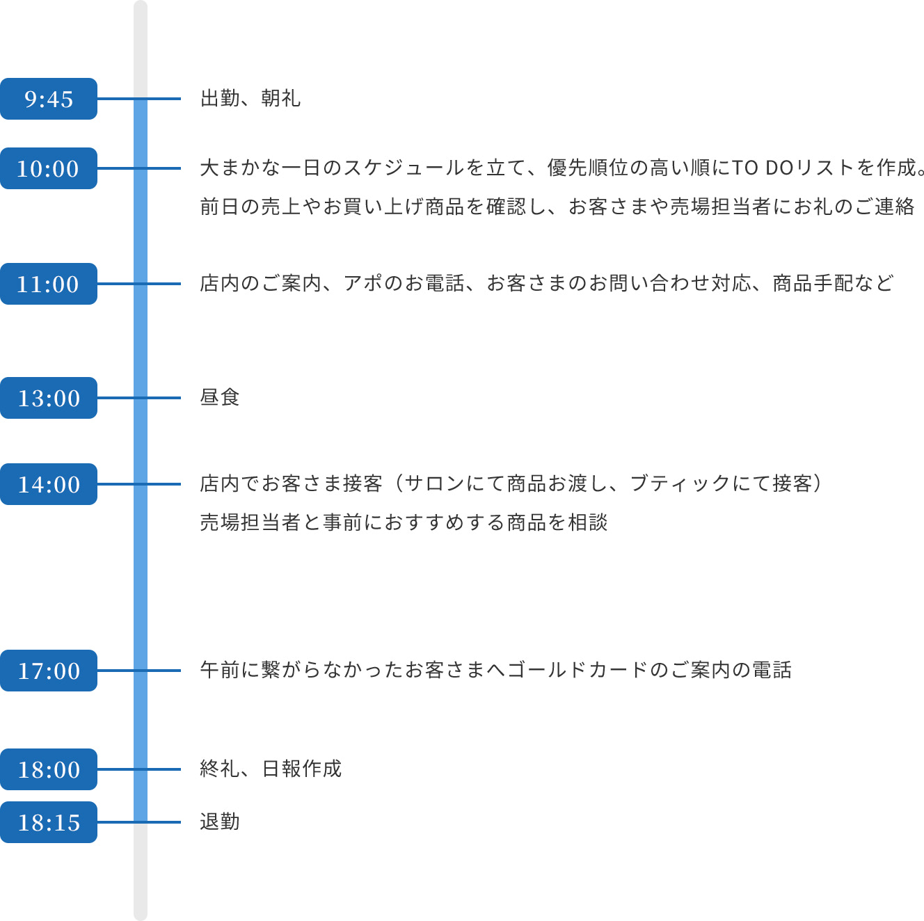 具体的には、店内のお得意様サロンや、ブティックでの接客、またはホテル催事の際の接客が中心になっておりますが、新規開拓中のお客さまへイベントのご案内なども行っています。