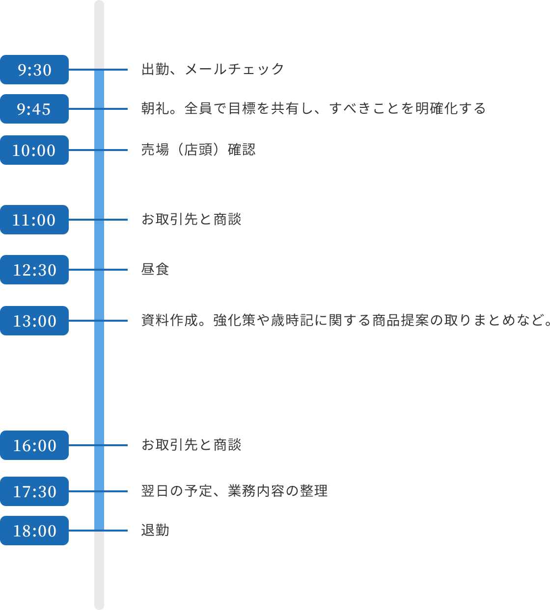 新規のお取引先の開拓、既存で入っていただいているお取引先とのコミュニケーションが主な役割です。あとは、お取引先だけではなくて、店舗の売場の販売員や店舗の担当者とのコミュニケーションというのも重要な仕事です。