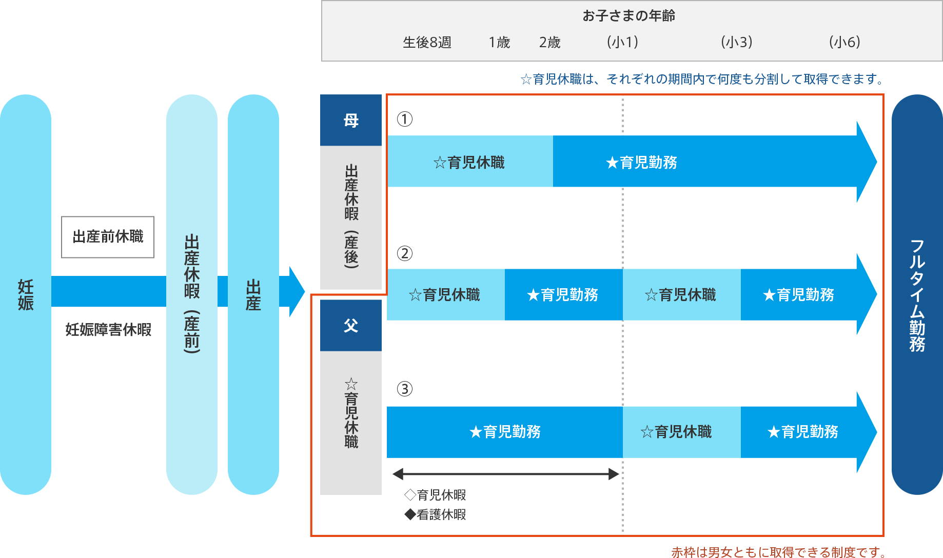 ・育児休職 図の①②③のいずれかのパターンで取得可。